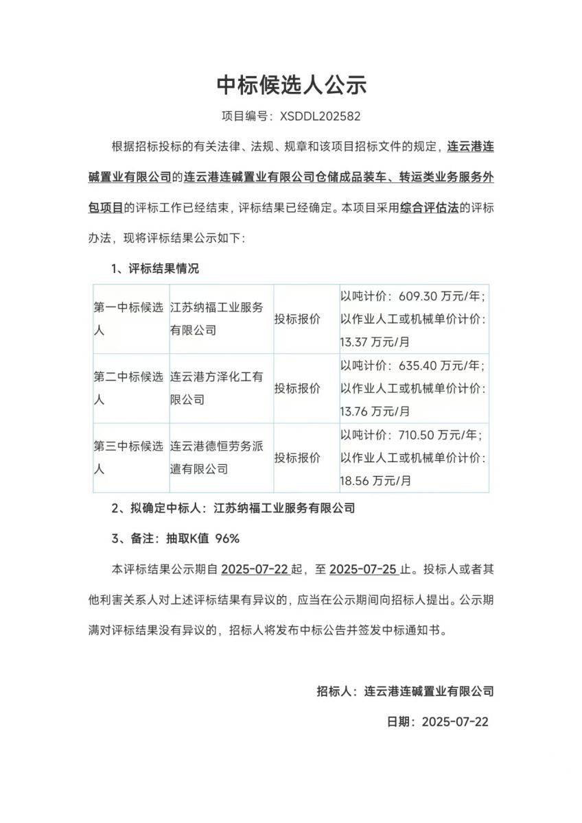 連云港連堿置業(yè)有限公司倉儲成品裝車、轉(zhuǎn)運類業(yè)務服務外包項目中標候選人公示