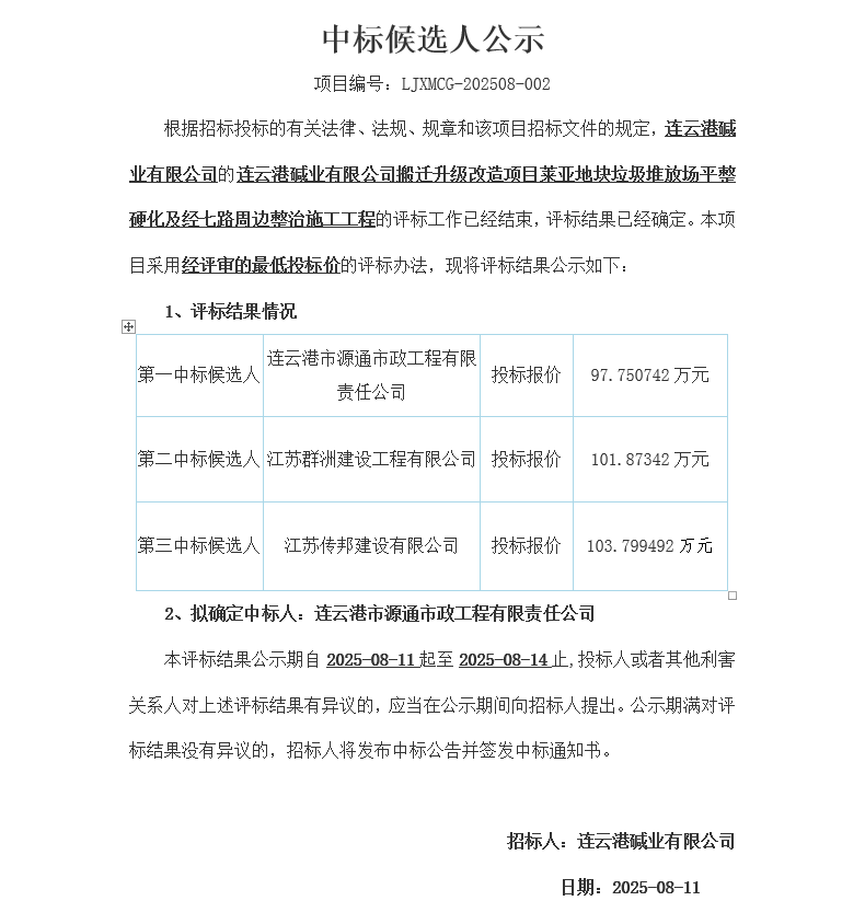 搬遷升級(jí)改造項(xiàng)目萊亞地塊垃圾堆放場(chǎng)平整硬化及經(jīng)七路周邊整治施工工程中標(biāo)候選人公示