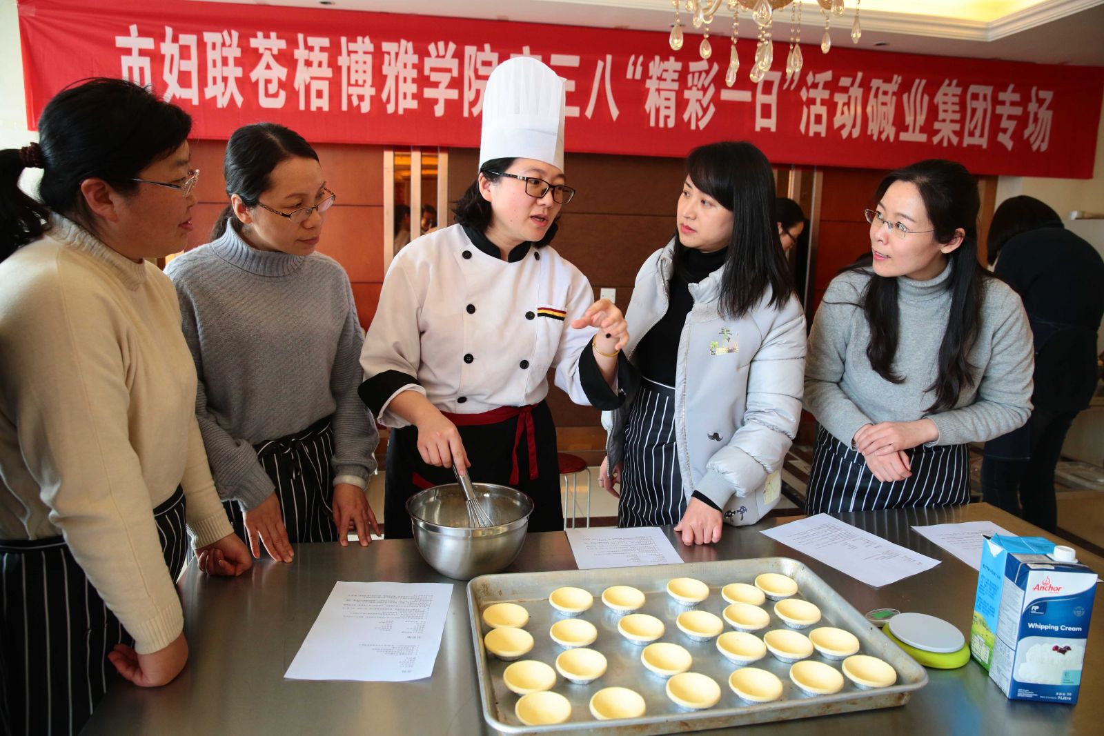烘焙培訓中,只見大家稱量、打蛋、調(diào)黃油,在老師的指導和幫助下,紛紛化身“小廚娘”,投身“甜蜜事業(yè)”。當打開烤箱的那一刻,香味四溢,現(xiàn)場彌漫著快樂和幸福的味道。