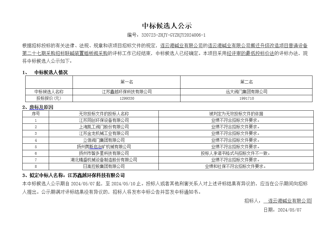 搬遷升級改造項(xiàng)目普通設(shè)備第二十七期采購招標(biāo)聯(lián)堿裝置插板閥采購中標(biāo)候選人公示
