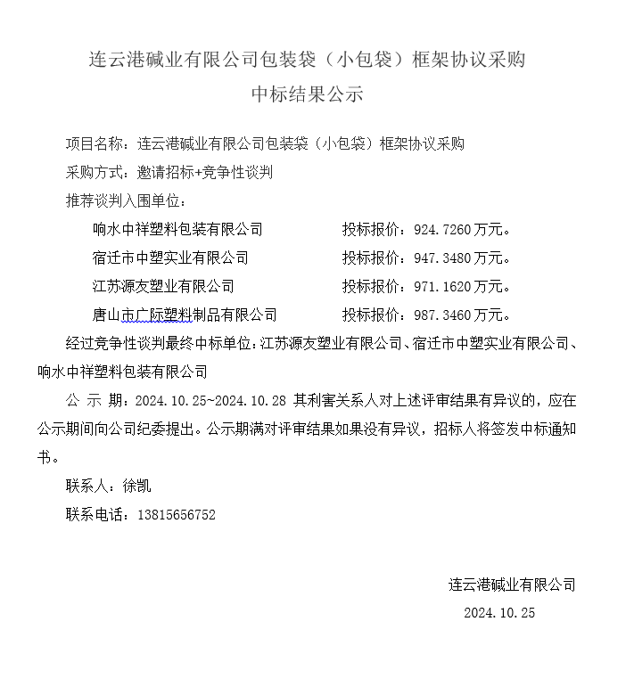 連云港堿業(yè)有限公司包裝袋(小包袋)框架協(xié)議采購中標結(jié)果公示